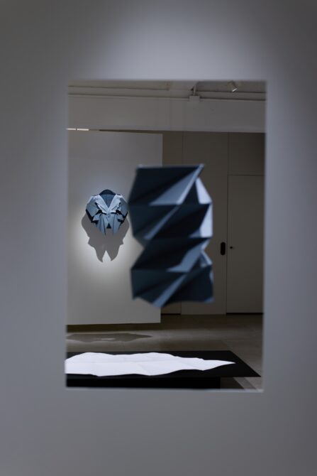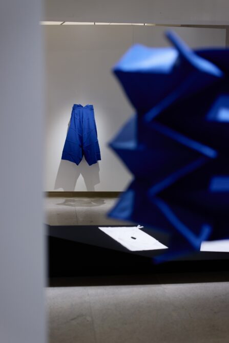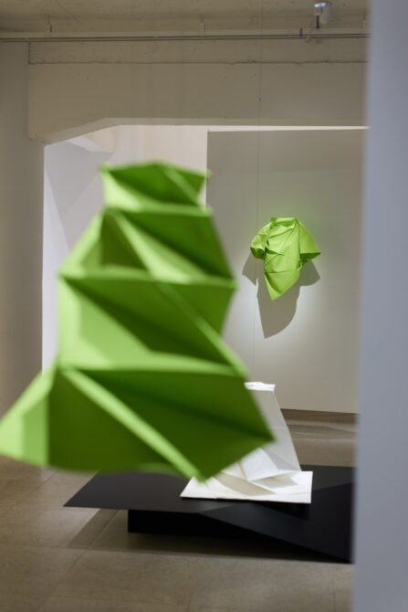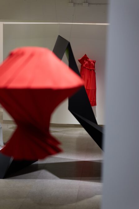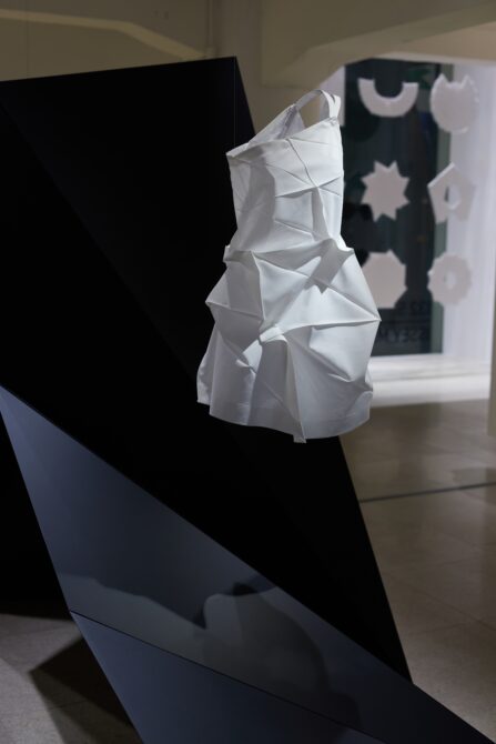 本展では、衣服の造形の根幹にある「折り構造」に焦点を当てながら、132 5.の創造のアプローチを多角的に紹介します。幾重にも折りたたまれた布の一端を持ち上げると、回転しながら立ち上がり、衣服としてかたちを成す——造形の美しさと驚きが交差するその変容のプロセスを、折りの動きを視覚化したインスタレーションとして展示しています。